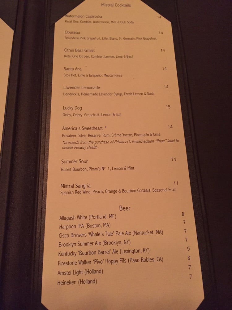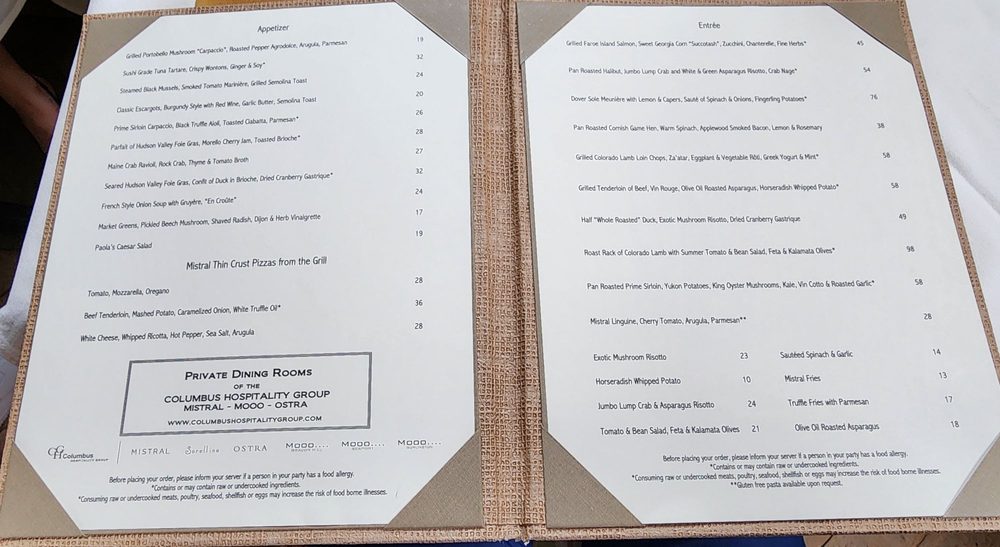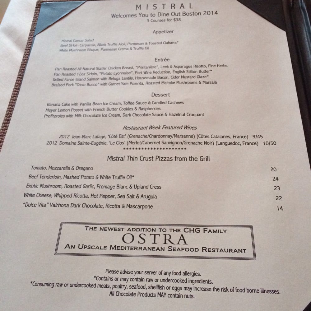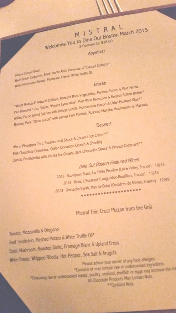 Mistral, a French-Mediterranean restaurant located in Boston, offers a classy and upscale dining experience with a variety of amenities such as free Wi-Fi, full bar, and outdoor seating. The menu features appetizers like Grilled Portobello Mushroom "Carpaccio" and entrees like Grilled Faroe Island Salmon. Customer reviews rave about the beautiful dining room, stellar service, and delicious food. Dishes like Chilled Corn Soup with Jumbo Lump Crab and Foie Gras Parfait showcase the culinary mastery at Mistral. The ambiance, professional servers, and impeccable flavors make it a go-to spot for celebrations and special occasions. If you're looking for a memorable gastronomic journey in Boston, Mistral is a top choice not to be missed.
